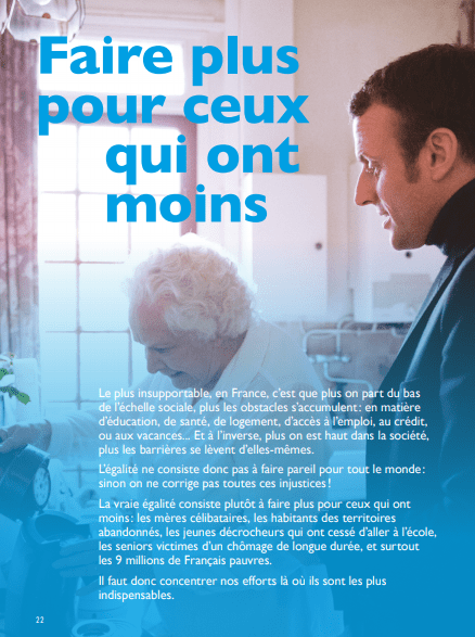 La page 22 du programme d’Emmanuel Macron annonce, photographie émouvante d’une retraitée se préparant un café sous le regard attentif d’Emmanuel Macron à l’appui, l’heure d’une politique qui mettrait en place une “vraie égalité” entre les individus. La page suivante liste alors les différentes propositions du candidat. Chacune est agrémentée d’une petite encoche, manière subtile et délicate, de suggérer que “c’est comme si c’était fait”. Mais qu’est-ce qu’une “vraie égalité” ? Si sur le papier glacé du programme, le futur-président semble avoir conscience de la situation extrêmement précaire de certain-e-s de ses concitoyen-nes, les politiques menées et les réactions qu’elles ont pu susciter prouvent qu’il y a là de quoi s’interroger.