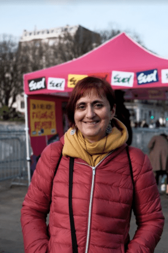 Du haut de ses 56 ans, Sylvie affiche un sourire rayonnant et rempli de sagesse. Les yeux pétillants de fierté, cette quinquagénaire vient d’Escaudin, dans le nord de la France. Si aujourd’hui, le 8 mars 2021, elle a parcouru une cinquantaine de kilomètres la séparant de Lille, c’est pour soutenir la cause féministe. Fille d’immigrés italiens venus travailler dans le bassin minier, elle est formatrice illettrisme et alphabétisation. Elle aide également des personnes à se remettre à niveau en français.