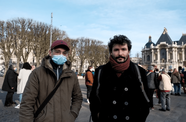 A droite, Thibault affiche un air grave. Cet enseignant, fraîchement arrivé à Lille, a tombé le masque pour la photo. Le sourcil droit, le cheveu bouclé et la moustache fournie, l’expérience se lit sur son visage. Thibault n’en est pas à sa première manifestation, et ce rassemblement s’inscrit dans la continuité de ses combats syndicaux et politiques.