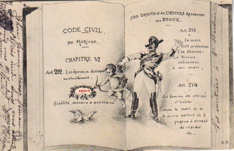 Dans le cadre de ce procès, c’est la sacro-sainte fidélité qui est évoquée pour justifier la condamnation de Barbara. Les épou-x-se étant tenu-e-s par les lois du mariage au renoncement à des relations sexuelles en dehors du mariage, iels se doivent d’entretenir des rapports sexuels avec leur conjoint-e (cela étant bien évidemment sous-entendu car le « devoir conjugal » a disparu du droit français, mais chassez le naturel…). Or cette « fidélité » constitue un héritage du Code napoléonien qui remonte à 1804. Un code dont les dispositions conjugales et familiales étaient déjà particulièrement rigide comparées à d’autres codifications européennes et au droit coutumier de son temps. Capable d’un côté de garantir la liberté et la propriété, il consolidait d’autre part la domination masculine. Exclues de la sphère publique, les femmes existent alors sous un statut de « mineures juridiques ». En vigueur jusqu’en 1938, l’article 213 énonce que « Le mari doit protection à sa femme, la femme obéissance à son mari. » Dans les faits, cela signifie qu’elle a besoin de l’autorisation de son conjoint pour chaque acte juridique. Elle ne peut par exemple pas bénéficier des revenus de sa propre activité. Le père du droit de la famille du Code Civil, Jean-Étienne Portalis (1746-1807) justifiait alors que « la puissance maritale, la puissance paternelle sont des institutions républicaines.»