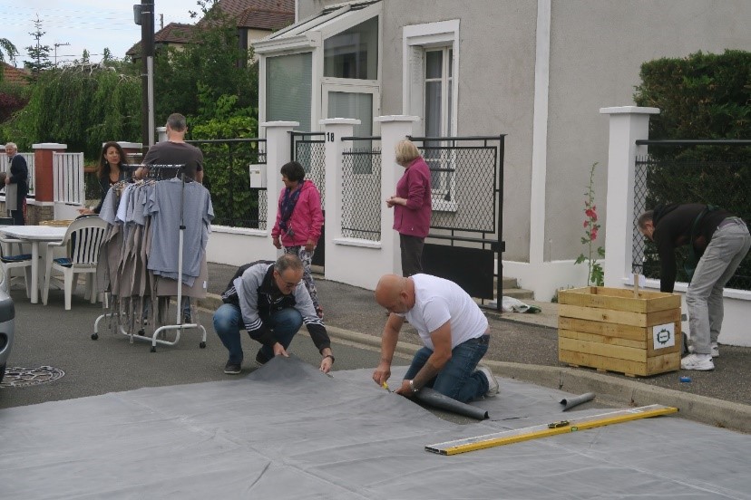 Le jour J, vers 9h, tout est prêt pour commencer la plantation. La route est bloquée toute la journée spécialement pour l’occasion. La mairie nous a fourni les bacs de fleurs, le terreau et l’enrobé-fraisat (une sorte de gravier qui sert notamment à lester les jardinières afin d’éviter les vols). Chacun a son rôle : Serge et Sylvie ont réceptionné les sacs de terres, les jeunes (Florian, Nathan, Matthieu) sont chargés de les distribuer à chaque voisin à l’aide de brouettes, d’autres comme Didier ou Mohammed découpent le revêtement en plastique qui permettra d’assurer l’étanchéité des jardinières, Valérie s’occupe des photos. Juste avant de commencer le travail, George a même préparé une petite surprise en attribuant à chaque voisin un tablier ou un tee-shirt personnalisé avec son prénom, sa fonction et le logo « Rue Verte ». De l’extérieur, ça ressemble presque à un chantier professionnel mais en réalité, tout le monde est d’humeur légère, alors que le mois de juin jette ses premiers rayons. On se serait presque cru dans D&CO, lorsque Valérie Damidot démarre le chantier avec un sourire jusqu’aux oreilles.