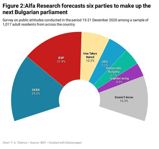 Tandis que la stratégie de Borisov reste inchangée et consiste toujours à une alliance de GERB avec la droite ultra-conservatrice bulgare, incarnée par l’alliance nationaliste des Patriotes unis, le second parti du pays en termes de députés, le BSP est en position de faiblesse. Ouvertement anti-Borisov mais ne faisant pas corps avec les manifestants de manière visible durant l’été 2020, il est accusé de double-jeu en faveur de Radev, Les deux partis institutionnels restaient cependant en tête des sondages en décembre 2020, leur donnant plus de 40% des 240 sièges de l’Assemblée nationale.