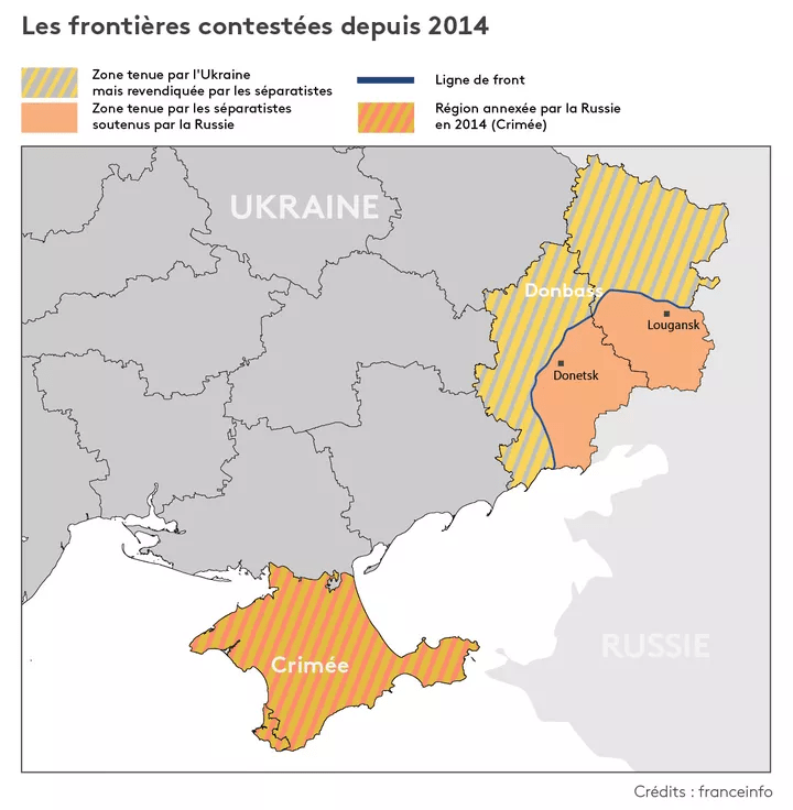 Les frontières de l’Ukraine contestées depuis 2014. (PIERRE-ALBERT JOSSERAND / FRANCEINFO)