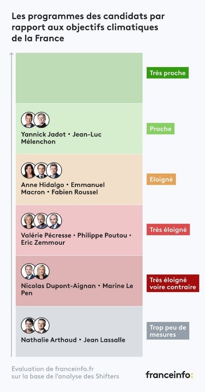 « The Shifters », une organisation associée au « Shift Project », « un think tank qui œuvre en faveur d’une économie libérée de la contrainte carbone » a réalisé une analyse de l’ensemble des programmes présidentiels en partenariat avec France Info. Le média public les a décortiqués au regard des objectifs climatiques de la France. Il considère qu’aucun-e candidat-e n’en est « très proche ». Yannick Jadot et Jean-Luc Mélenchon en sont « proche[s] » ; Anne Hidalgo, Emmanuel Macron et Fabien Roussel, eux, en sont « éloigné[s] ».