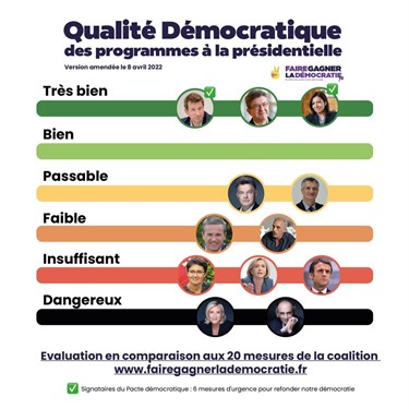 Le collectif « Démocratie ouverte », né en 2012, vise à « promouvoir toutes les initiatives qui œuvrent pour gagner en pouvoir d’agir, mieux décider ensemble et mettre à jour nos systèmes politiques ». Pour le scrutin du chef de l’Etat, il a lancé la campagne « Faire gagner la démocratie » et a, dans ce cadre, établi un « Pacte démocratique », seulement signé par Anne Hidalgo et Yannick Jadot. C’est aussi à cette occasion que l’organisation a analysé les programmes des différent-e-s candidat-e-s. Les chefs de file de Solférino et des Verts ainsi que Jean-Luc Mélenchon se voient attribuer la mention « Très bien ».