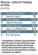 Six associations et laboratoires d’idées pro-Union Européenne (« EuropaNova », « Institut Jacques-Delors-Notre Europe », « Confrontations Europe », « Europartenaires », « Maison de l’Europe » à Paris et « Mouvement Européen France ») ont évalué huit candidat-e-s. Emmanuel Macron obtient 17,5/20, Yannick Jadot 15/20 et Anne Hidalgo 12,5/20.