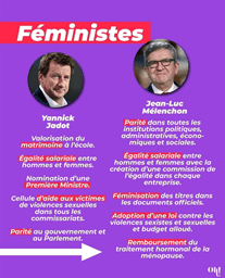 Ohmymag, qui se décrit comme « le média social féminin », a jeté un œil aux programmes des postulant-e-s à la plus haute fonction du pays. Résultats : Yannick Jadot et Jean-Luc Mélenchon sont « féministes » ; « Ça commence à être pas mal » pour Fabien Roussel et Philippe Poutou.
