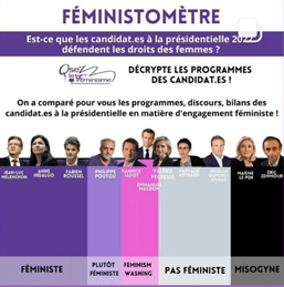 « Osez le féminisme », association qui se distingue notamment d’autres organisations féministes pour son opposition à la GPA et au travail du sexe, a dressé son « féministomètre ». Pour elle, 3 candidat-e-s seulement sont « féministe[s] » : Jean-Luc Mélenchon, Anne Hidalgo et Fabien Roussel.