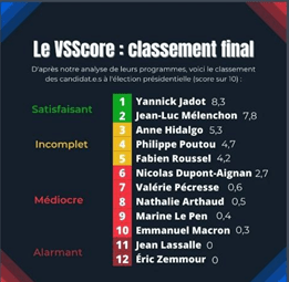 L’« Observatoire étudiant des violences sexistes et sexuelles » a publié le classement final de son « VSScore » : Yannick Jadot et Jean-Luc Mélenchon sont jugés « satisfaisant[s] », respectivement 1er avec 8,3/10 et 2e avec 7,8/10 ; Anne Hidalgo, « incompl[ète] », est 3e avec 5,3/10.