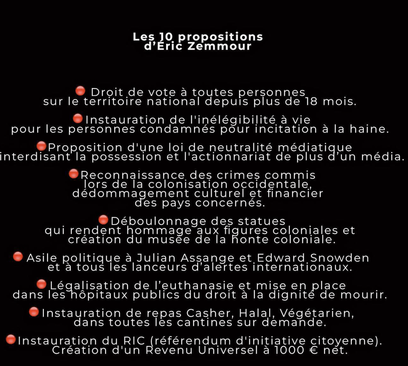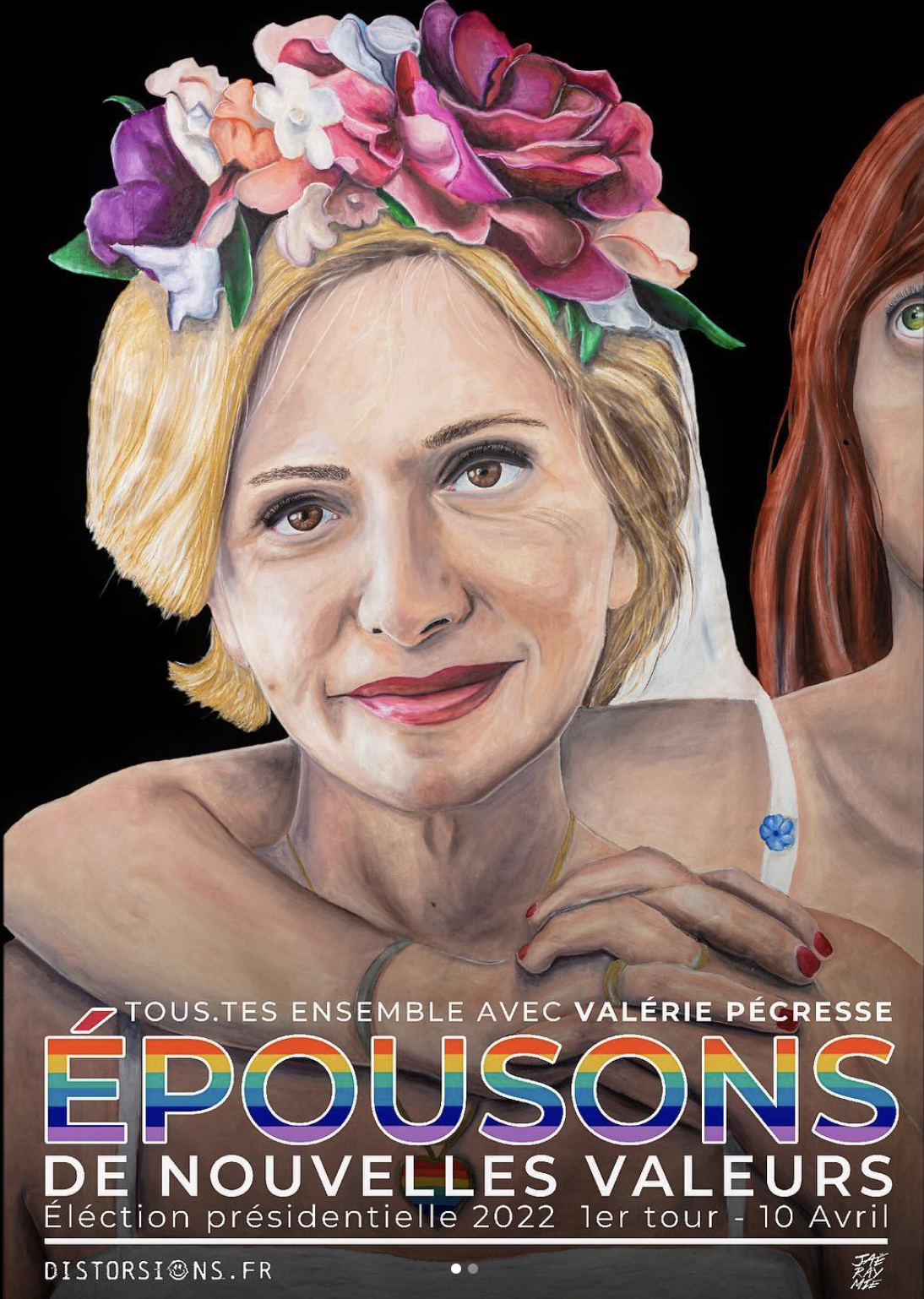 J : Je suis passé par pleins de changements et c’est encore le cas jusqu’à maintenant. Le principal changement, c’est qu’au tout début de Distorsions, je ne savais pas que j’allais le sortir pendant les élections présidentielles. A la base je voulais sortir le projet beaucoup plus tôt. Quand j’ai peint Marine Le Pen il était très probable qu’elle soit candidate aux élections présidentielles. Par contre quand je peins Éric Zemmour en novembre 2020, il n’est pas du tout candidat à l’élection présidentielle. C’était un an et demi avant qu’il se présente. Quand j’ai peint Valérie Pécresse, c’était six mois avant qu’elle se présente. À ce moment-là, je peignais plutôt un panorama de la politique française et de la politique au sens large puisqu’il y avait aussi Zemmour : polémiste, éditorialiste, parce qu’on ne va peut-être pas dire que c’est un journaliste… Finalement, je n’avançais pas aussi rapidement sur les peintures, j’avais du boulot à côté, etc. Plus on avançait dans le temps plus on se faisait rattraper par la réalité, et on s’est rendu compte que la plupart étaient candidats à la présidentielle. Il y a un choix qui a été fait : le projet comptait une douzaine de peintures à la base, finalement j’ai enlevé des peintures au dernier moment pour me concentrer sur la présidentielle vu que c’était l’actualité. Il y a d’autres choses qu’on aurait voulu faire, notamment approfondir le narratif, mais on n’a pas pu, par manque de temps, par manque de moyens… Un projet c’est des compromis, des concessions. Il faut savoir s’adapter. Sur les six peintures originales on a présenté quatre candidats qui se présentaient réellement aux élections : Pécresse, Zemmour, Le Pen et Macron. Pour chacun des candidats on a fait un petit programme avec dix points clefs. Pour Valérie Pécresse, qui dans Distorsions est devenue une militante pour les droits LGBTQ+, son programme parle d’accès à la GPA, d’accès à la pilule remboursée par la sécurité sociale, qui sont des vrais combats dans notre monde mais qui ne sont pas réellement portés par des politiques.