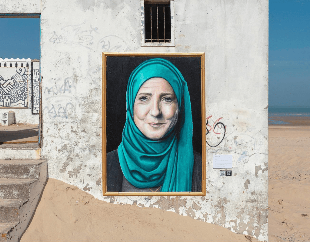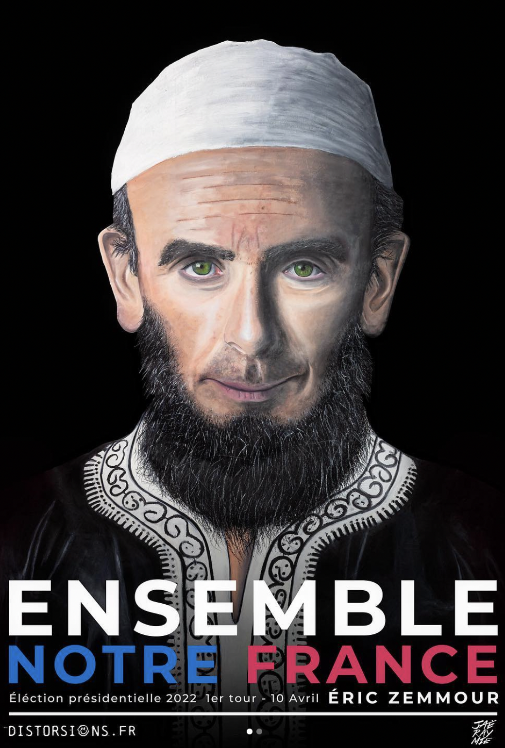Jaëraymie : C’est un projet qui a été assez long à mettre en place mais en ce qui concerne l’idée c’est pendant le premier confinement, donc mars 2020. Avec ma compagne on parlait de stigmatisations, de personnes qui ne se mettent pas à la place des autres, qui ne font pas preuve d’empathie. Je me suis dit que ce serait fou de voir Marine Le Pen en femme qui porte le voile. Après il y a eu tout le travail de création de cette fiction, de ce monde parallèle : pourquoi elle porterait le voile, qu’est-ce qui fait qu’elle se serait mise à porter le voile ? On est ailleurs, sur une planète alternative : Marine Le Pen existe mais elle y a pris un autre chemin. Dans les années 90, elle a réellement défendu des migrants quand elle était avocat commis d’office. Dans la fiction qu’on a écrite, on s’est dit « et si, à ce moment-là, elle en avait rencontré un dont elle serait tombée amoureuse ? ». Elle aurait découvert l’islam, la foi, et se serait mise à porter le voile. Elle devient alors cette femme républicaine, voilée et qui défend les migrants. Ce mécanisme-là on l’a appliqué à tout un tas d’autres personnages à chaque fois en se posant la question : comment on fait pour aller de la stigmatisation qui existe ? Il fallait choisir une idée qui soit associée à une phrase suffisamment forte pour qu’elle soit rentrée dans l’inconscient collectif. C’est facile de comprendre la peinture de Marine Le Pen en femme voilée parce qu’on connaît tous et toutes ce qu’elle a dit sur les femmes voilées. C’est pareil pour les peintures de Zemmour, Macron, Sarkozy… La phrase qu’ils ont dite justifie en elle-même le « pourquoi » de la peinture. La peinture fait le lien entre la fiction et la réalité puisque la peinture est dans la rue. La peinture devient une brèche, comme si elle venait d’une autre dimension et avait atterri chez nous.
