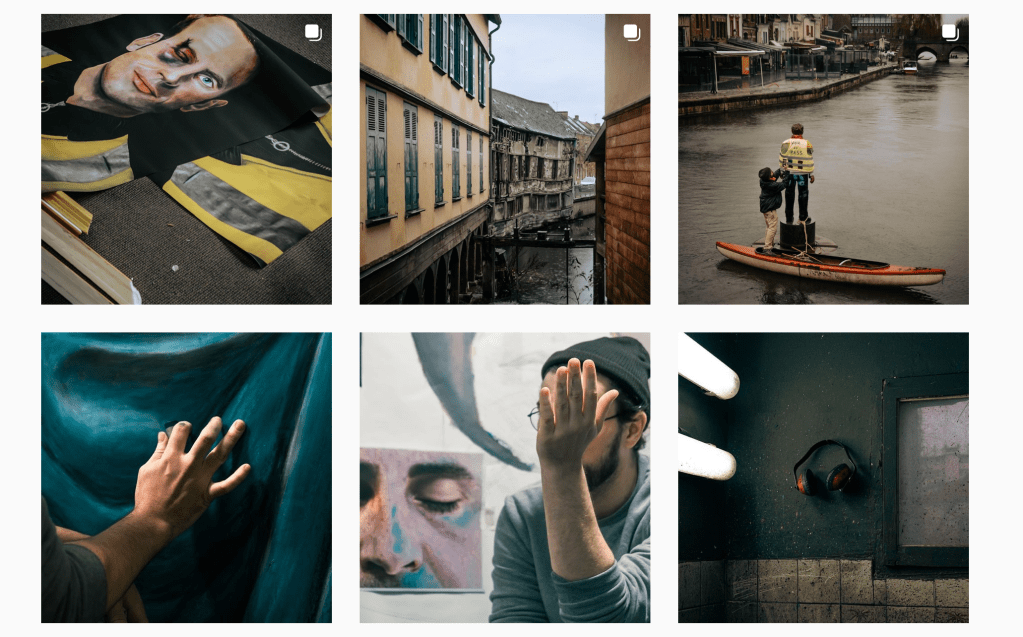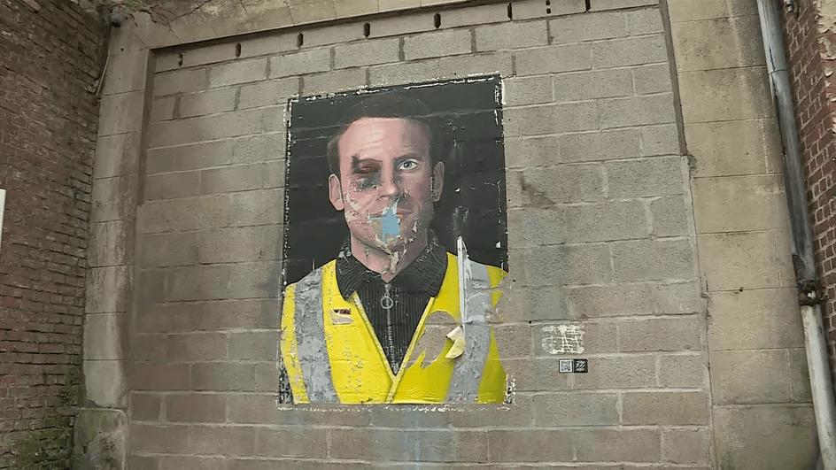 J : Une fois que les peintures ont été collées, il y a eu des effets complètement hallucinants pour certaines d’entre elles. La peinture de Macron à Amiens a été recouverte en 24h à la demande de la préfecture. Ils ont recouvert toute la peinture de planches en bois pour la masquer. Il y a eu une dizaine de réactions en chaine jusqu’à ce qu’un groupe de Gilet Jaune décide de découvrir à nouveau la peinture. Un plaquage a été remis, enlevé… Ça a participé à ce que la peinture soit vue et débattue, à Amiens en tout cas : « il parait qu’on est une ville ouverte sur la culture, on a un festival de Street Art, et là on décide de le masquer… ». À travers les réseaux sociaux ça a commencé à jaser aussi et en l’espace d’une journée la peinture est devenue virale, à son petit niveau. Elle a été partagé par des politiques, notamment Mathilde Panot, députée France Insoumise. On a rencontré un groupe de Gilet Jaune, les Mutilés pour L’exemple. On a rencontré Mélanie N’goye-Gaham. C’était super. François Ruffin nous a proposé de poser une réplique de la peinture dans son QG de campagne. Notre fiction, les peintures, ça a eu un effet dans la réalité. Le collectif des Mutilés m’a demandé si c’était possible d’avoir des reproductions de ma peinture pour la manifestation qu’ils organisaient le 3 avril. Ils les ont ensuite mises sur des pancartes sur toute la manifestation, il y avait des dizaines de Macron Gilet Jaune. C’est là que je trouve ça devient vraiment intéressant : il y a un effet sur le réel. En plus d’avoir un effet sur le réel, ça a un effet sur ce dont on est en train de parler. La peinture parle des mutilés.