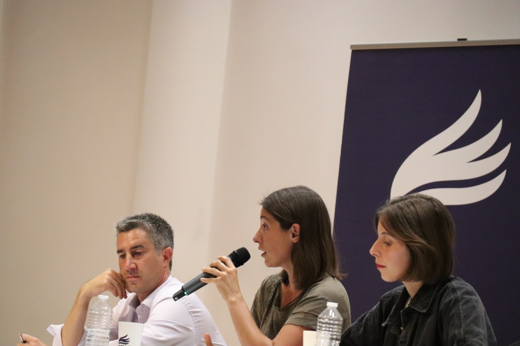 « Quand on martèle matin et soir que le travail a un coût, on organise les têtes baissées, la dégradation du rapport de force et la défaite idéologique », estime Sophie Binet, qui est également membre du comité exécutif de la CGT et chargée de l’égalité femmes-hommes. Quelques instants plus tard, elle poursuit : « La gauche a accepté le financement de la protection sociale par l’impôt à la place de la cotisation [NDLR : le gouvernement de Michel Rocard a créé la Contribution sociale généralisée (CSG) en 1990] et le plafonnement des allocations en fonction des ressources. » « Ainsi, on organise l’assistanat et la stigmatisation », considère la syndicaliste. Cette intervention, comme les autres et celles de son camarade, est applaudie.