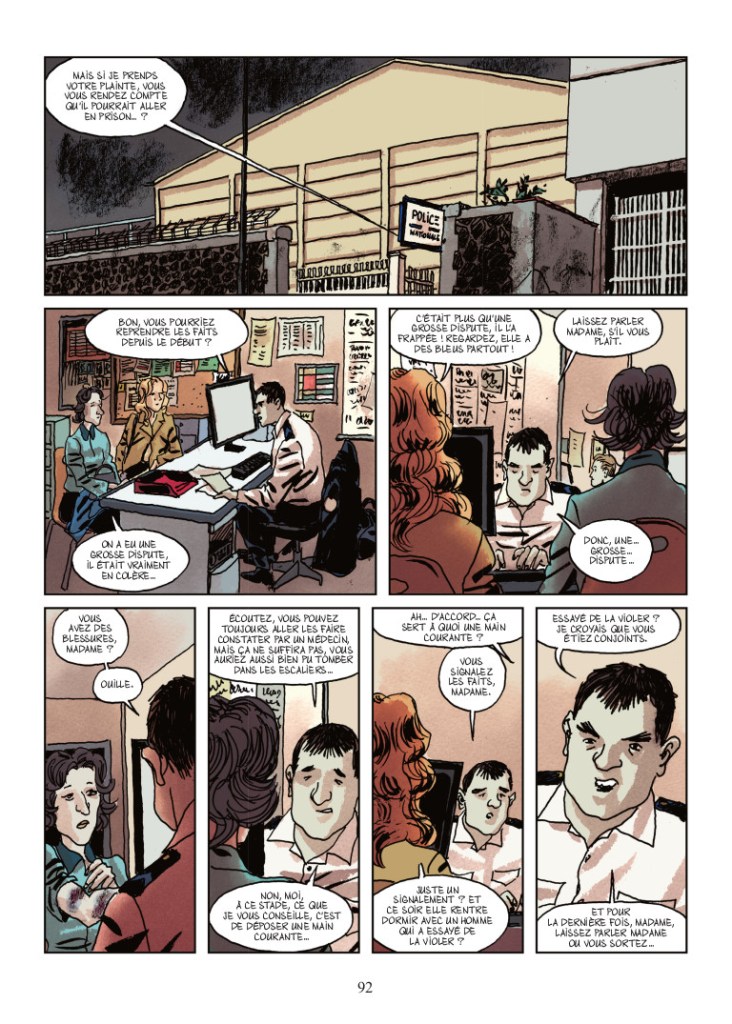 Mais plus fort encore : dans l’Assommoir 2.0, la femme peut encore mourir sous les coups de son mari. L’adaptation de Mathieu Solal et Xavier Bernoud nous entraîne dès le départ dans l’intimité des violences conjugales, symbolisée par la ténébreuse relation entre Gervaise et Lantier. Elle nous emmène aussi jusque dans les bureaux des commissariats de police où la femme violentée s’entend répondre qu’en définitive, elle l’a peut-être bien cherché. Des récits qui résonnent fortement avec l’actualité : en 2021, la France recensait 113 féminicides.