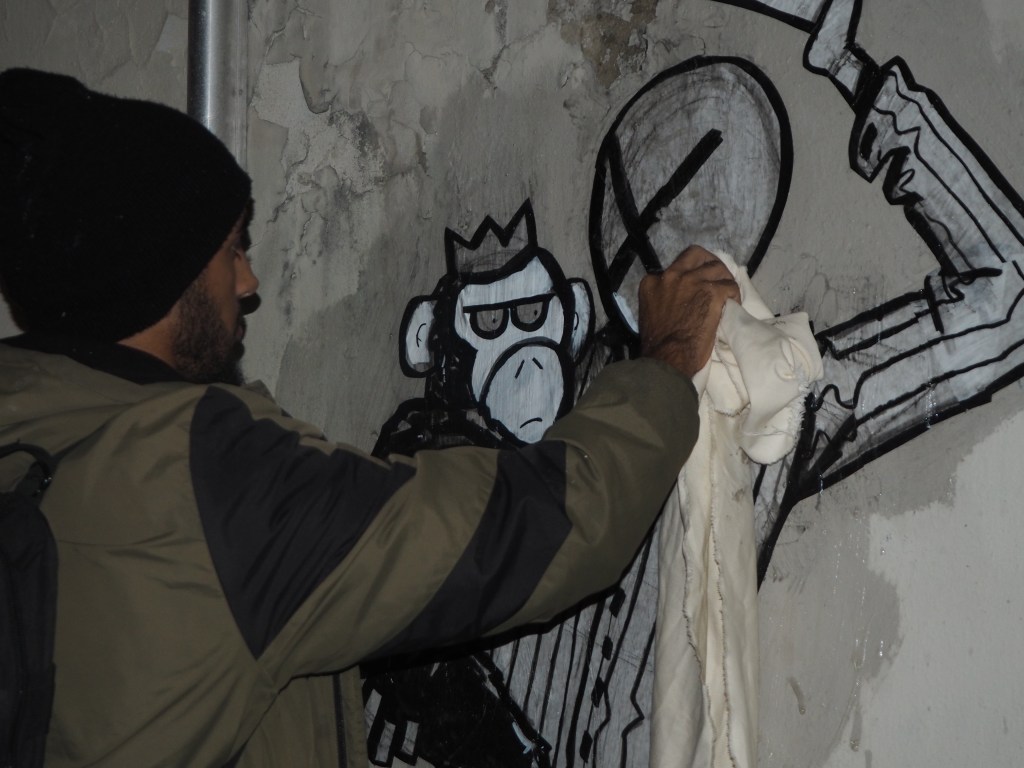 PREPARATIFS. Il est 23h lorsque No Luck et Mara se donnent rendez-vous dans les ateliers de l’association montpelliéraine Line Up. La nuit est tombée depuis au moins deux bonnes heures, et pourtant elle n’est pas très fraîche. Montpellier reste chaude du soleil qui la martèle depuis quelques jours, et ce malgré la pluie qui tombe épisodiquement. La Lune est pleine ce soir. L’air est humide de la pluie qui menace de tomber. « J’ai bien envie d’aller traîner du côté de l’Avenue de Toulouse ce soir » lance Mara à son collègue et ami No Luck. Cette avenue, proche du centre-ville, est connue pour sa vie nocturne, et de grands murs blancs s’offrent aux artistes qui passent par là. « Ouais, pourquoi pas » répond No Luck. Pour eux, l’emplacement n’a pas vraiment d’importance, ils fonctionnent au coup de cœur. Tous les deux postés dans un coin de leur atelier, chaque station avec son matériel et son énergie, ils règlent les derniers préparatifs avant leur session nocturne. Mara s’occupe de découper son dessin, de le ranger grossièrement dans son sac et de préparer sa colle, tandis que No Luck choisi ses pinceaux et sélectionne la peinture qu’il prendra avec lui ce soir. Il opte pour du rouge, étant en ce moment dans sa période « ocre ». Membres depuis deux ans de Line Up, les deux artistes sont devenus amis avant l’association, et continuent de travailler ensemble. « Essentiellement, Line Up nous permet de faire comme avant, sauf qu’on peut avoir des envies différentes. » S’ils n’ont pas la même façon de travailler, puisque Mara est colleur et No Luck peint sur les murs, ils collaborent souvent ensemble, ayant trouvé un certain équilibre dans la combinaison de leurs travaux. Pour Mara, la préparation est presque terminée, il ne manque plus qu’à trouver un pinceau. « Je regarde si j’en n’ai pas un, mais je crois que je les ai tous laissé chez moi » crie No Luck à Mara, en train de fouiller dans une pièce adjacente à leur atelier. Au bout de quelques minutes, tout est prêt. « On a tout ? » Il est 23h34, et une fois le rideau de fer qui protège les locaux de Line Up baissé, on peut se mettre en marche. Dehors, l’humidité est passée, la pluie partie avec elle. Il ne pleuvra pas. La nuit peut commencer.