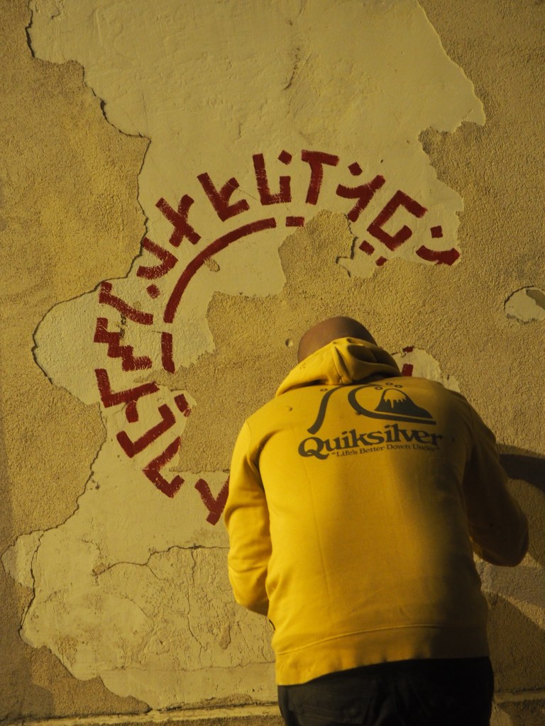 NO LUCK. A l’opposé de Mara, No Luck ne colle pratiquement jamais, il peint. Préférant des murs abîmés à de grands espaces lisses, il aime « peindre dans les murs brisés, ça donne du sens à mes dessins. » Faisant apparaître sous des crêpis défraichis des runes anciennes, comme si le temps venait seulement de les révéler, No Luck devient la nuit archéologue. Celui qui, après avoir travaillé dans le graphisme, est artiste depuis cinq ans. Ayant toujours eu affaire à des typographies, il a finalement trouvé la sienne et l’appose aux murs qu’il trouve. Sorte de mélange de runes et de symboles énigmatiques, l’écriture de No Luck embellie l’espace. Un travail esthétique qui a un certain prix : si Mara est colleur, et ne risque presque rien à exercer son art, No Luck n’a pas cette chance en tant que peinte. « Je peux me faire coincer par les flics » explique-t-il. Et pour ça, il ne prend pas de risques inutiles. Ce soir, le mur abîmé déniché au coin d’une rue voit son crêpi tomber en lambeaux. N’hésitant pas à enlever des pans entiers abîmés, No Luck créé son espace et le façonne selon son envie. Il est alors temps de sortir les outils : un pinceau, de la peinture rouge et un compas géant. « En ce moment, mes écritures sont en cercle » précise l’artiste qui a déjà commencé à peindre après avoir préparé son canva. Cette fois, c’est Mara qui est en retrait. Personne n’ose parler, de peur de déranger la concentration du peintre. « Ah, voilà, j’ai raté » s’exclame soudain No Luck, après avoir mis de la peinture au mauvais endroit. Des rires et des essais pour l’enlever plus tard, ça ne prend pas. Tant pis, le raté restera là. La nuit bat son plein, tandis que No Luck est absorbé ailleurs. Apportant les détails finaux, l’artiste demande à Mara comment terminer. « Je ne sais pas comment compléter. » C’est donc avec quelques symboles que No Luck rempli les espaces qui lui restent, avant de remballer sa peinture et son pinceau.