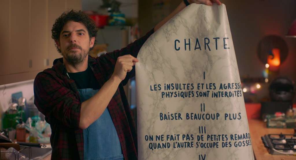I.K. : On s’est demandé quelles étaient les règles auxquelles on croit. La comédie qui me plait, c’est la comédie où rien n’est fabriqué, même dans le jeu des acteurs. Je déteste les acteurs qui essayent d’être drôles. Il faut défendre son personnage et c’est tout. C’est comme les éléments de la charte : on marque qu’il faut baiser plus, et bien sûr que c’est drôle, mais c’est aussi très important qu’il y ait de la sexualité dans un couple. Donc c’est à la fois décalé dans la formulation, c’est punchy, et en même temps c’est vrai et pertinent. On a pensé aux choses pertinentes pour nous.