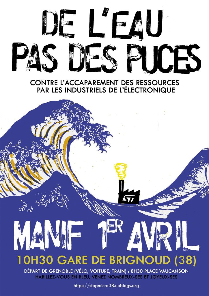 Depuis un an une cinquantaine de citoyens de la région s’est regroupée sous le nom de collectif STopMicro38 afin de dénoncer les pratiques écocides de STMicrolectronics mais aussi pour stopper la frénésie d’agrandissement du site de Crolles. Le 1er avril dernier environ mille personnes ont marché en scandant «De l’eau pas des puces!» à Brignoux, sous la pluie, tout un symbole.