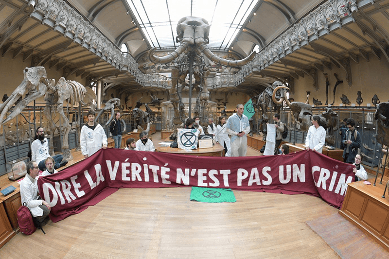 Le 9 octobre 2022, il y a un peu plus d’un an, des scientifiques membres du collectif Scientifiques en rébellion organisaient, conjointement avec Extinction Rébellion, l’occupation de la grande galerie de l’évolution du Muséum National d’Histoire Naturelle (MNHN), à Paris. L’objectif, alerter sur l’urgence de la situation écologique, dénoncer l’inaction politique et informer les visiteurs des causes aussi bien que des conséquences du dérèglement climatique.