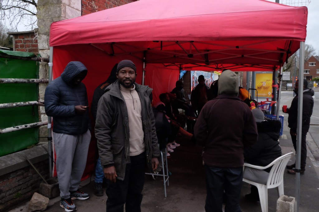 Une fumée grise s’échappe tranquillement du vieux baril enflammé. Autour, cinq ou six personnes se réchauffent. Les assiettes remplies de riz et de viande en sauce circulent sous le chapiteau rouge. Mains se serrent, musique retentit, discussions fusent. Comme chaque jour, Happy Patrick, l’une des cheffes de file du mouvement, tient compagnie à ses camarades. « Ça fait longtemps que la loi est contraignante, lance-t-elle. La préfecture demande, pour nous régulariser, qu’on lui fournisse un contrat, mais elle nous empêche de travailler légalement. Comment on fait ? »