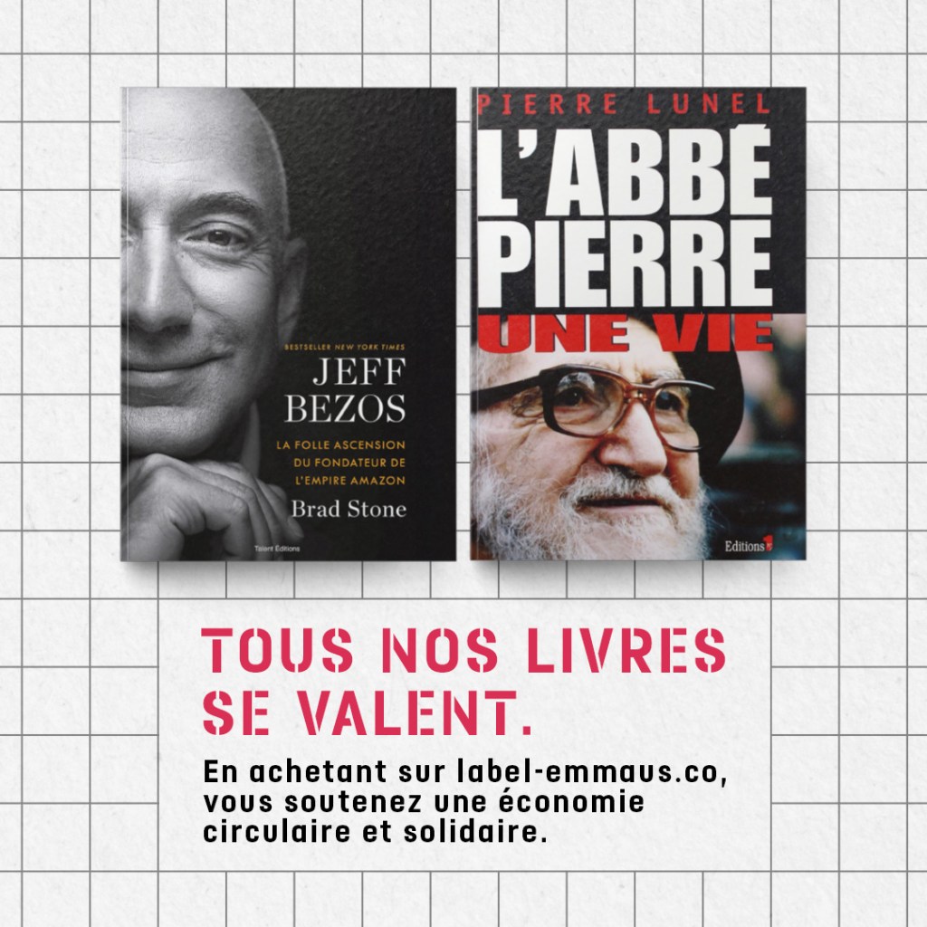 Un an après la campagne menée contre le géant Vinted, « Si tu ne le portes pas, donne-le ! », le Label Emmaüs lance une fronde contre Amazon, « Tous nos livres se valent. » Un visuel percutant mettant en miroir deux biographies, deux portraits d’humains que tout oppose : Jeff Bezos et l’Abbé Pierre. 34% des acheteurs de livres achètent de l’occasion, généralement via des plates-formes telles que Vinted, Momox ou encore Leboncoin. Cette invisibilisation du don et de la solidarité pousse Emmaüs à entrer en résistance face à une concurrence déloyale.